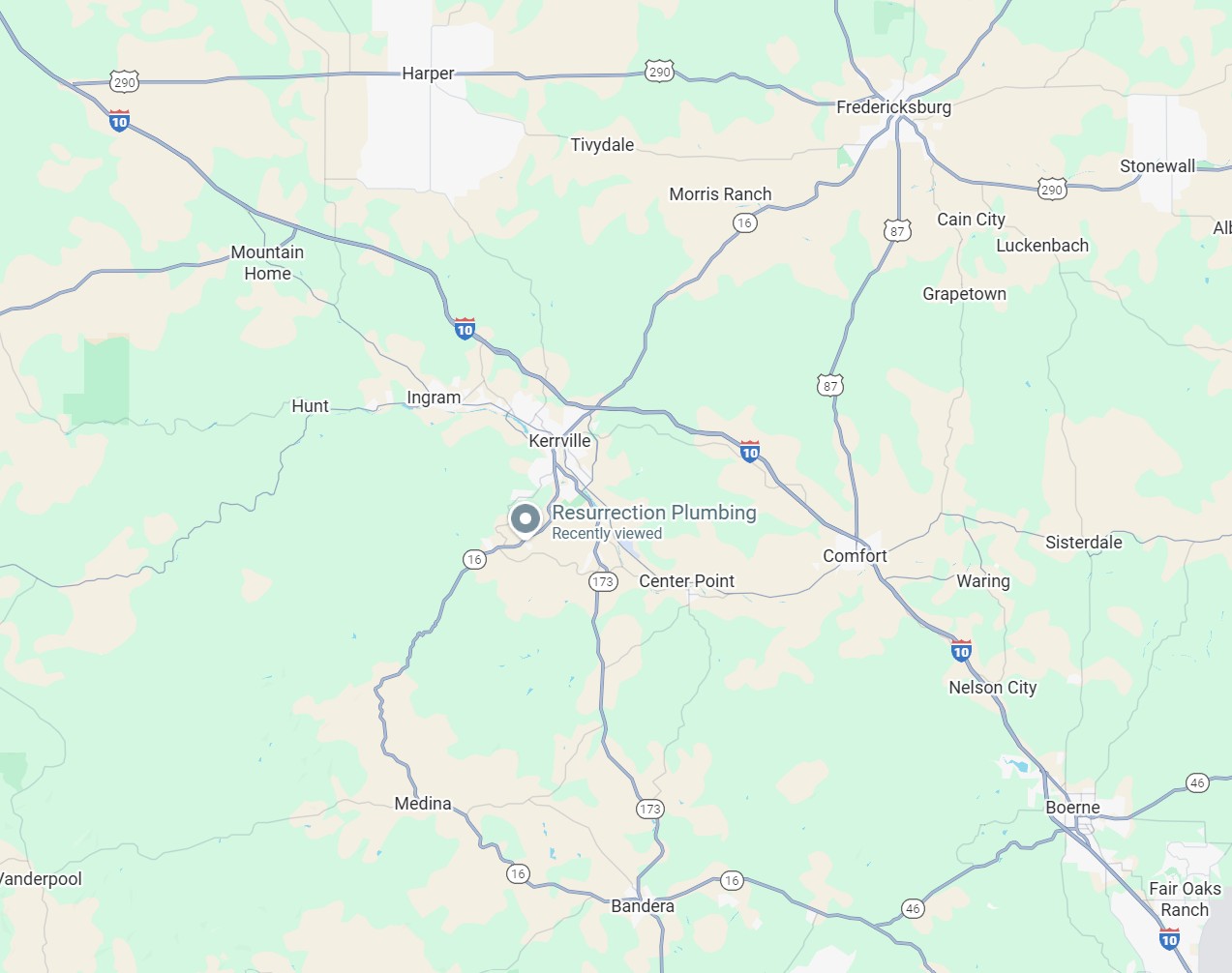 While Resurrection Plumbing is proud to be considered one of the best plumbing companies in the Kerrville and Fredericksburg, TX area, we are available to serve your needs in any of the surrounding communities in the Texas Hill Country including Ingram, Center Point, Comfort, Bandera, Medina, Harper, Hunt, Boerne, Stonewall, and Doss. Reach out to us today to see if we serve your area, to discuss your needs, or to schedule an appointment.